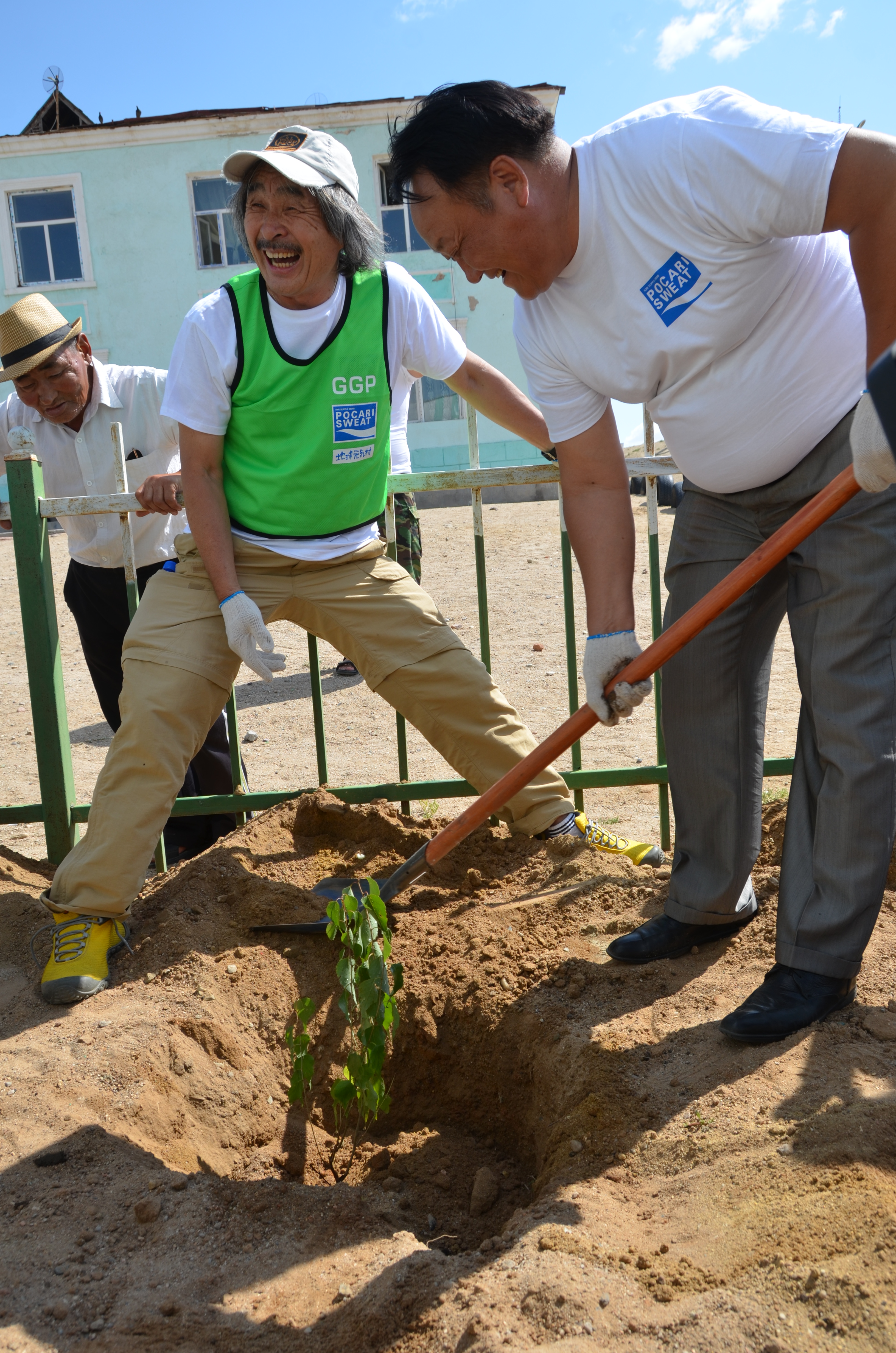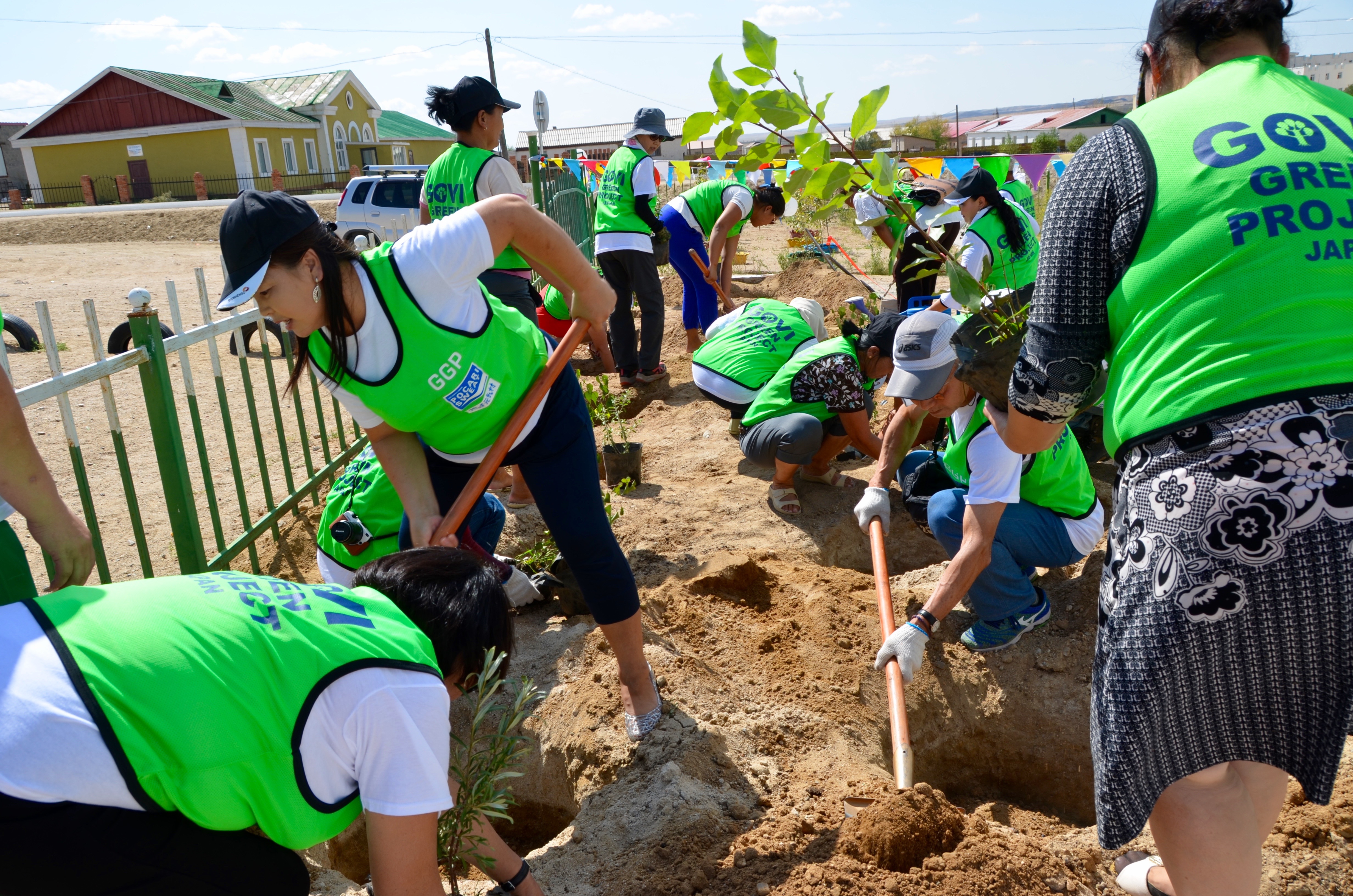 おそろいの「GOVI GREEN PROJECT JAPAN」ユニフォームに身を包み、県知事やJICA職員そしてパワフルなモンゴル女性たちにご協力いただきながら、褐色の乾いた大地に約150本の苗木を植林しました。ここでは参加者の一人、植木職人の荒木宣夫さんの専門知識が大活躍でした。