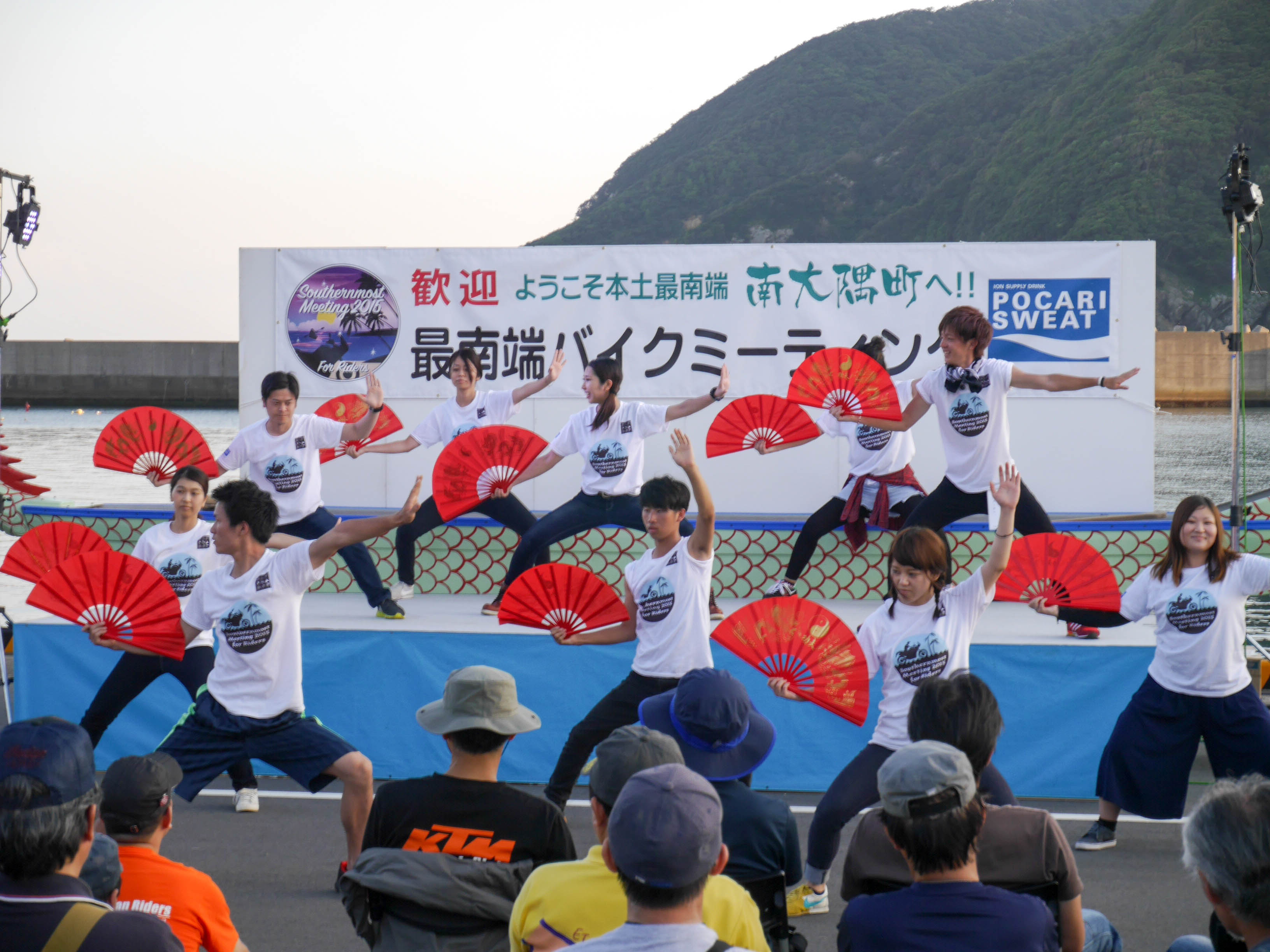 最南端バイクミーティングのゴール及びイベント会場となったのは鹿児島県肝属郡南大隅町の大泊港。佐多岬に向かう佐多岬ロードパークの入口付近になる小さな湾で穏やかな海が広がる静かな漁港。大きなゴールアーチを最南端を目指して走って来たバイクが続々とゴールしました。